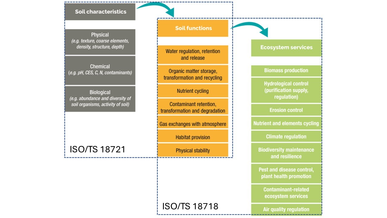 Figure 1: Linkeage between soil characteristics and soil functions and associated ecosystem services according to recent ISO standards